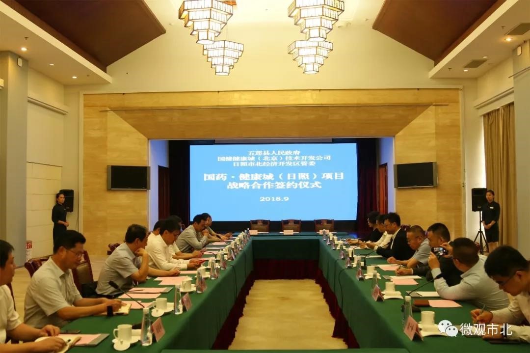 2018年9月18日上午,國藥健康城(日照)項目戰略合作簽約儀式在飛天賓館舉行。市委常委、副市長劉兆亮,縣委副書記、縣長朱貴友,縣委副書記袁利強,副縣長許京勇及國藥集團融資租賃有限公司總裁王國梁、國健健康城(北京)技術開發有限公司董事長王信琦等有關同志出席瞭簽約儀式。