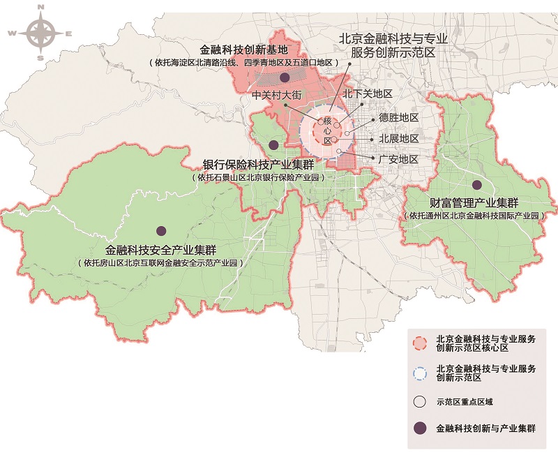 2.北京金融科技與專業服務創新示範區核心區:以西城區北展地區(原動批地區)、海澱區北下關地區和中關村大街沿線區域爲主體,建設北京金融科技與專業服務創新示範區核心區,選擇60萬平方米特定樓宇,重點聚焦監管科技、風險管理、金融安全和專業服務四個領域發展金融科技産業,建設金融科技監管實驗區。核心區發揮與金融街相接的區位優勢,與國家金融管理中心相互呼應,構建科技資源爲金融機構賦能、金融要素助力科技創新的良好格局。