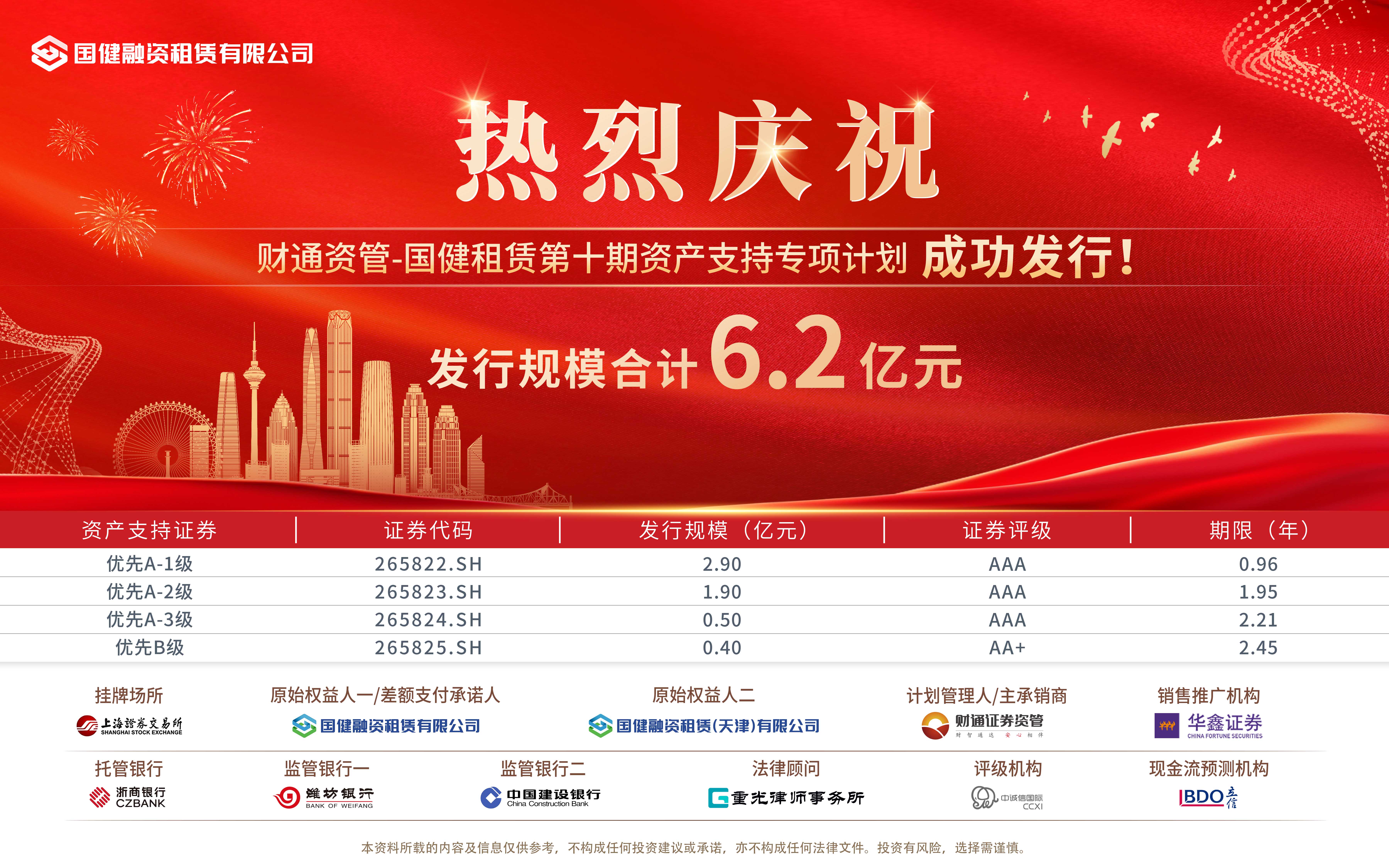 2025年7月15日,國健融資租賃有限公司攜手國健融資租賃(天津)有限公司作爲原始權益人,在上交所成功發行“财通資管-國健租賃第十期資産支持專項計劃”。